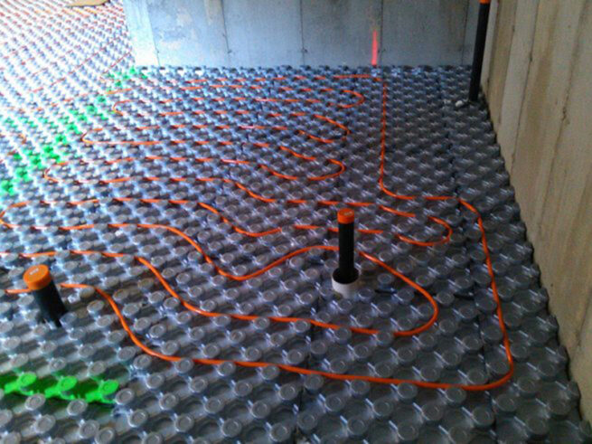 The In-Floor heating is installed on the ground employing high-density polyethylene pipes. A layer of expanded polystyrene thermal insulation is used to hold it in place, which in turn ensures that the heat is transmitted to the upper part of the floor and not to the floor below. Finally, a layer of mortar is poured on top, a layer of cement glue and finally the finish we want to give it.